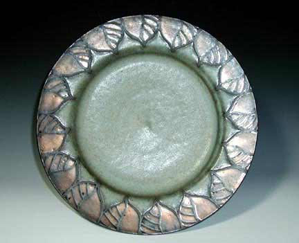 LEAVES PLATTERThis 12" diameter platter is a very useful size for serving cookies or cake but you can also put it in a plate stand and use it as a purely decorative piece. By the way you can put this (or any of my pieces) in the dishwasher. The glazes are all fired at stoneware temperatures and won't wash off. This platter is $84 |