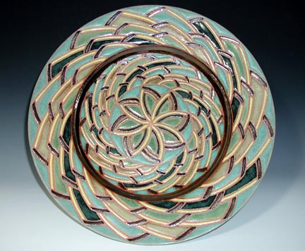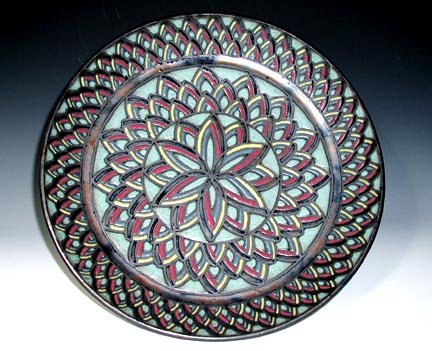 I pierce the foot on this 13" platter so that it can be hung because it really is more decorative than functional. Although this design has obvious links to my exploration of woven patterns, it was partly inspired by my studies of fractal geometry and chaos theory--thus my symbolic representation of the universe or mandala. It does take an amazingly long time to layer glazes on all of these little surfaces so this is my most expensive piece at $390. |