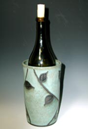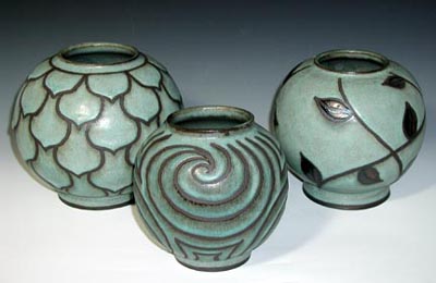 GLOBE VASESGlobe vases are terrific for centerpiece flower arrangements. Five or six short stemmed blooms create an attractive centerpiece without impeding conversation across the dining room table. Shown here are a large lotus design globe vase ($62), medium climbing leaf globe vase ($54) and a small swirl design globe vase ($44). I also make large ones than these. Just ask me! |