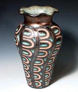 FEATHER VASE.In peach, cerulean and gold, this vase is fun and elegant. And for those who prefer a stronger color statement I can substitute a red or plum glazefor the peach glaze. It is approximately 10" tall and is priced at $150. |