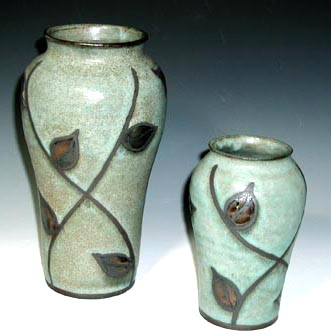 CLIMBING LEAF VASESEach of these vases is decorated freehand so that no two are exactly alike. The interplay of leaves and branches suggest the harmony and balance of nature. They are lovely on their own or complementing your floral arrangement. The large vase ($78) is approximately 9.5 inches tall and the small vase ($38) is approximately 6.5 inches tall. You can get something in between as well. Just ask me. |
