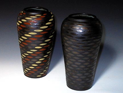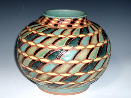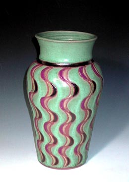 MAYPOLE VASE.A brighter more colorful look with plum, gold, green, yellow and cerulean glazes on a red stoneware clay. I just loved the idea of a bouquet of flowers sitting atop a maypole to celebrate the coming of spring--or a May wedding. This vase is approximately 11" tall and is $120. |