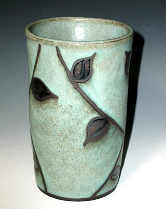 ROYAL LOTUS VASE.This 10" vase has a rich look to balance a sumptuous bouquet of flowers or just to grace a table top or shelf without benefit of adornment. In the arts & crafts tradition it is reminiscent of the ceramic arts of the East without appearing ethnic. It is $120. |